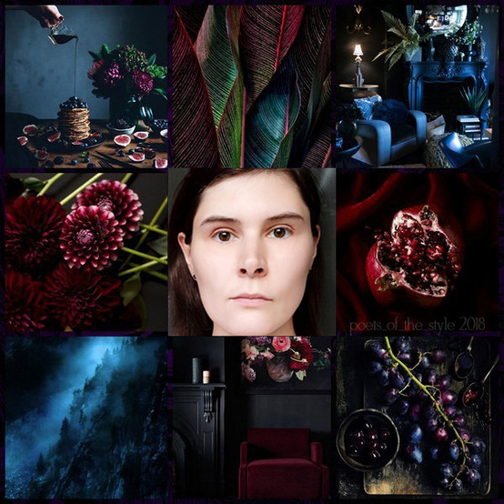 Both palettes are languid and delicious, both beautifully highlight depth, but Winter, upon closer inspection, slightly pales and desaturates the complexion, thereby creating a sickly impression. The autumnal setting, on the other hand, blends harmoniously with the face, intensifying its colors and bringing it to life. Overall, with such a high level of contrast, the winter palette can also be explored, avoiding only the iciest shades. The main option, however, is Dark Autumn. Let's move on.